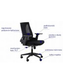 Krzesło zostało wyposażone w mechanizm typu TILT z funkcją kołyski, blokadą w pozycji roboczej oraz płynną regulacją wysokości siedziska.
